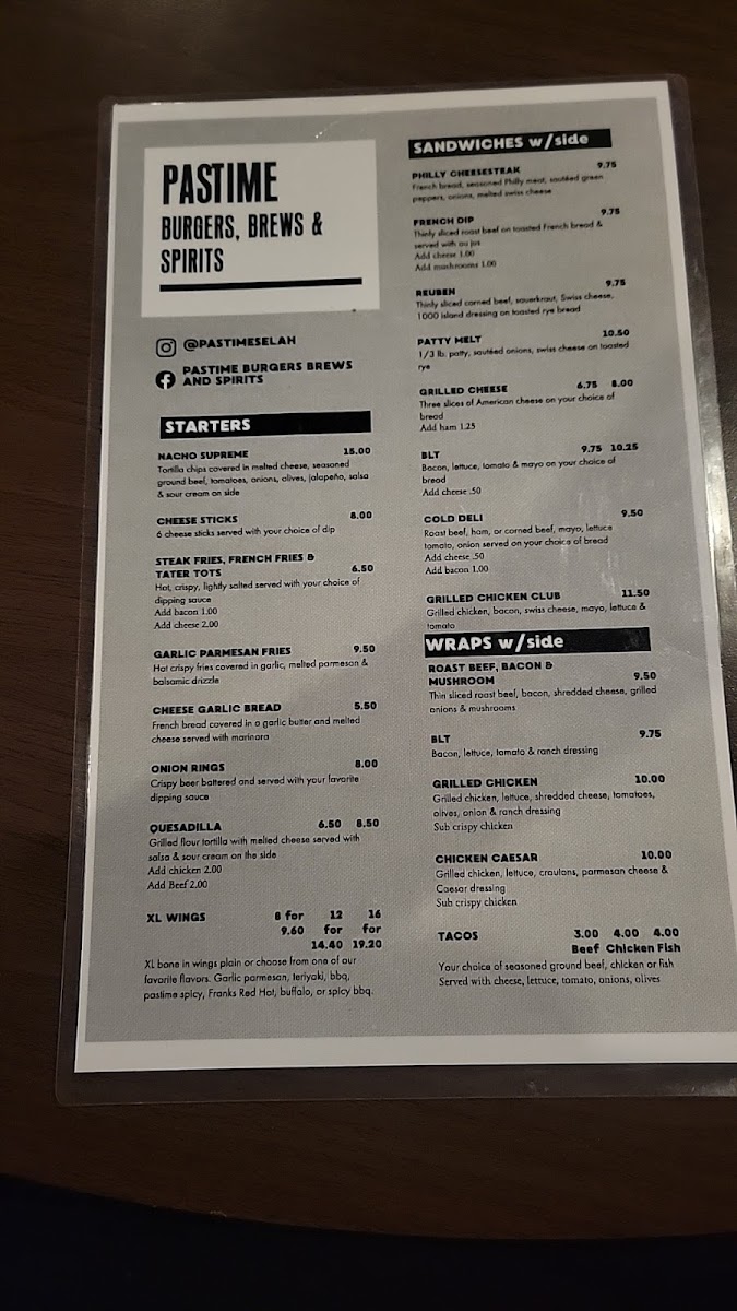 Pastime Burgers, Brews & Spirits Menu (2025 Update)
